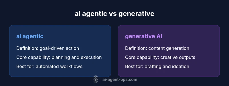 ai agentic vs generative are two ends of the AI spectrum that describe how systems operate in real-world automation. In practice, ai agentic designates agents that can set goals, plan steps, and execute actions to achieve outcomes, often interacting with external environments or other services. Generative AI, by contrast, focuses on producing new content or completing patterns based on learned representations from large data corpora. The distinction matters because it shapes how teams structure control, feedback, and governance. According to Ai Agent Ops, understanding these differences helps teams design architectures that balance autonomy with safety, enabling smarter automation without sacrificing predictability. This balance is especially critical when you want AI to operate across heterogeneous tools and datasets while delivering reliable results. The central question becomes: should the system primarily act, or should it primarily create content? In many modern pipelines, the answer is a hybrid: agentic orchestration layered on top of generative components to manage tasks and outcomes.