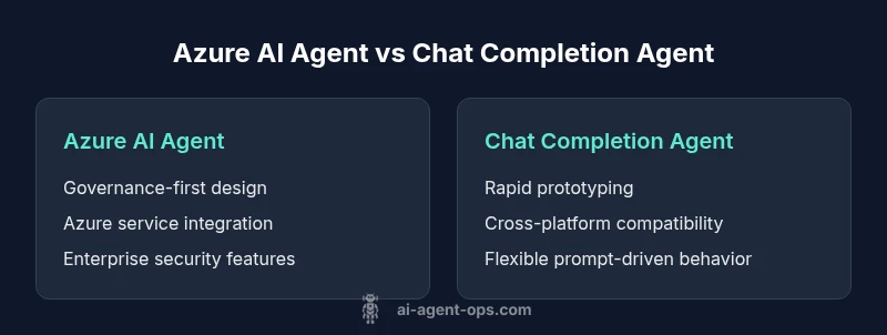 According to Ai Agent Ops, Azure AI Agent excels at enterprise governance, security, and scalable orchestration within Microsoft ecosystems, while a chat completion agent offers flexible, rapid prototyping and broad language-model access. For teams delivering production workflows with strict compliance, Azure AI Agent is typically the safer choice; for quick experiments, cross-platform experiments, or prototyping, a chat completion agent provides speed and versatility.