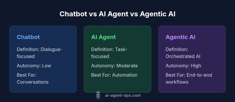According to Ai Agent Ops, the landscape of conversational and autonomous AI can be distilled into three core categories: chatbot, AI agent, and agentic AI. A chatbot is primarily a dialog-driven interface designed to understand user input, retrieve information, and provide guided responses within a limited scope. In contrast, an AI agent refers to a software component that can perceive its environment, plan a sequence of actions, and execute tasks with a degree of autonomy. Agentic AI sits atop these foundations, enabling advanced autonomy by combining strategic planning, memory, and governance to carry out complex, multi-step workflows across disparate tools. When you see the phrase chatbot vs ai agent vs agentic ai, it signals a progression from surface-level conversation to deep automation with orchestration. For development teams, this distinction matters because architecture, data flows, and risk profiles shift with each tier. The Ai Agent Ops team emphasizes that choosing among these options is less about labeling and more about aligning capabilities with business goals and governance requirements.