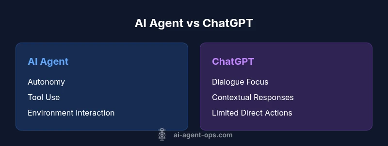 When someone asks how is ai agent different from chatgpt, they’re comparing two ends of the AI spectrum. ChatGPT operates as a powerful conversational model optimized for language understanding and generation. An AI agent, by contrast, combines a cognitive layer with action-oriented components that can interact with software, services, and data sources. In practical terms, ai agents are built to execute tasks with a degree of autonomy, while ChatGPT primarily assists through dialogue. This distinction matters for teams designing intelligent systems, automating business processes, and building agentic AI workflows. According to Ai Agent Ops, understanding these differences helps teams select the right tool for the job and avoid overreliance on a chat-centric paradigm when real-world action is required.