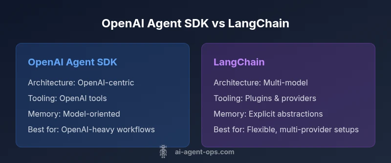 Understanding the landscape around open ai agent sdk vs langchain requires clarifying what each option offers. The OpenAI Agent SDK is a toolkit from OpenAI that streamlines the creation, testing, and deployment of autonomous agents that rely on OpenAI models and official tooling. LangChain, by contrast, is a broad framework that unifies prompts, memory, tools, and agents across multiple model providers. According to Ai Agent Ops, the distinction is less about capability and more about ecosystem alignment and orchestration philosophy. If your goals include tight integration with OpenAI's proprietary tooling, OpenAI Agent SDK often provides lower friction and stronger guarantees for model behavior; if your priority is multi-model orchestration, rich plugin ecosystems, and experimentation, LangChain tends to offer more flexibility.