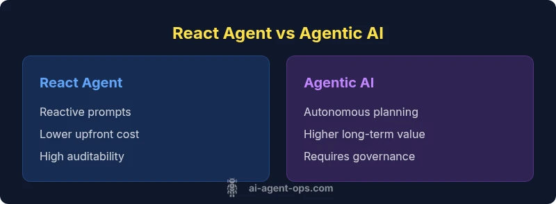 In the landscape of AI agents, a React agent usually refers to a system that reacts to inputs with predefined prompts and deterministic logic. By contrast, agentic AI describes a class of agents capable of setting and pursuing goals, planning steps, and adapting behavior to changing objectives. For teams exploring react agent vs agentic ai, the distinction shapes everything from architecture to governance. The goal here is to equip developers, product teams, and business leaders with a framework for choosing the right approach for a given problem. This guide anchors definitions in practical terms, provides decision criteria, and translates theory into actionable checklists. Throughout, Ai Agent Ops grounds recommendations in real-world constraints and governance realities.