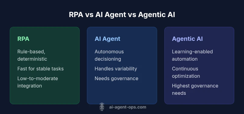 RPA vs AI Agent vs Agentic AI refers to three automation approaches: RPA (robotic process automation) for rule-based tasks; AI agents for autonomous action within defined goals; and agentic AI, which adds learning and self-improvement to agent behavior. According to Ai Agent Ops, the right choice depends on task complexity, governance, data access, and how you plan to scale automation across teams. In short, start with RPA for stable processes and explore AI agents or agentic AI as complexity grows.