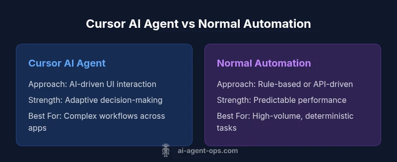 Cursor AI agents fuse perception, decision-making, and action, enabling interactions with software through user interfaces and data streams. In the world of cursor ai agent vs normal automation, the core difference is that cursor agents operate in dynamic, multi-application environments, learning from context and adapting to new tasks without explicit reprogramming. According to Ai Agent Ops, this paradigm shifts automation from static scripts to agent-driven workflows capable of navigating screens, interpreting unstructured inputs, and coordinating across tools. Yet, governance, risk, and cost considerations are essential. The phrase cursor ai agent vs normal captures a spectrum of capabilities—from OCR and form filling to decision prompting and cross-modal actions. While traditional automation excels at repeatable, well-defined tasks, cursor AI agents unlock cross-system automation where APIs are incomplete or legacy software dominates. The result is a more flexible automation surface that complements, rather than replaces, API-first pipelines. For developers and leaders, the cursor ai agent vs normal distinction signals a move toward adaptive automation that learns from interaction history.