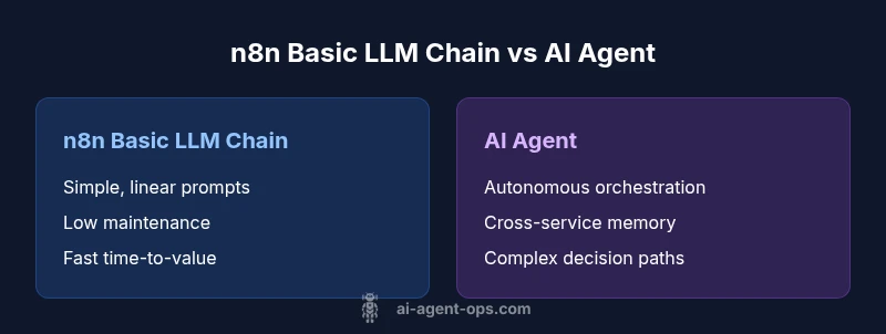 When you compare n8n basic llm chain vs ai agent, the choice is usually about simplicity versus autonomy. According to Ai Agent Ops, a basic n8n LLM chain is quick to set up for lightweight tasks, with predictable cost and clear prompts. An AI agent, by contrast, orchestrates multiple steps and systems, delivering scalable automation but at a higher setup and maintenance cost. Use case and risk tolerance drive the decision.