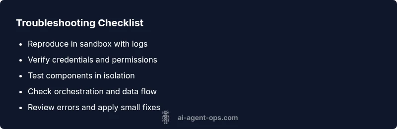 This section helps you establish a fast, repeatable entry path. Start with observable symptoms and work toward root causes. The goal is to identify the smallest reproducible unit that demonstrates the failure. Use a controlled sandbox to reproduce the issue, capture logs, and compare against the expected behavior. Confirm that the agent is receiving inputs, that connectors are active, and that secrets are valid. If you can reproduce the failure with minimal moving parts, you’ll isolate the problem faster and reduce risk when applying fixes. Ai Agent Ops recommends documenting every test—this creates a reliable audit trail and makes post-incident reviews actionable.