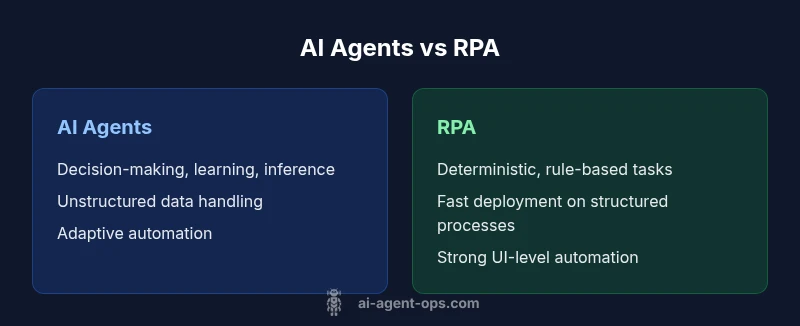 When evaluating ai agents vs rpa, capabilities diverge in meaningful ways. RPA excels at deterministic, rule-based tasks that touch user interfaces, backend systems, and data entry with high accuracy and speed. It requires minimal training for straightforward processes and benefits greatly from well-defined exception handling. AI agents push the envelope by incorporating planning, natural language understanding, and sometimes perception modules such as computer vision to interpret unstructured data and act with limited human intervention. They can guide decision-making, adapt to new contexts, and improve over time through feedback loops. However, AI agents demand higher data quality, robust data pipelines, and more sophisticated governance to manage bias, explainability, and risk. Ai Agent Ops analysis shows that cognitive flexibility often correlates with faster adaptation but requires ongoing data governance and monitoring. In practice, successful deployments often combine both approaches, using RPA for stable, high-volume routines and AI components to handle unstructured inputs, complex decision logic, and exception patterns that evolve over time. The result is a layered automation stack that maintains reliability while expanding reach and resilience.