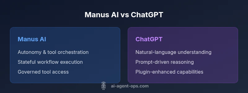 The comparison between Manus AI agent and ChatGPT is not about which model is universally better; it’s about which paradigm suits a given goal. The phrase manus ai agent vs chatgpt is often used to describe two dominant approaches in modern AI-enabled workflows: autonomous agents that can plan, select tools, and execute actions, versus conversational LLMs that generate text and reason about prompts. According to Ai Agent Ops, the experimentation with these models reveals that Manus AI’s strength lies in orchestrating a chain of operations across systems, while ChatGPT provides rich, human-like dialogue and flexible prompt-based reasoning. For developers and leaders, the practical takeaway is to match the architecture to the task: automate with Manus AI where precision and repeatability matter, and rely on ChatGPT for dialogue, ideation, and knowledge retrieval. In this article, we examine the core differences, the tradeoffs, and a structured framework to decide when to deploy each approach within an agentic AI workflow.