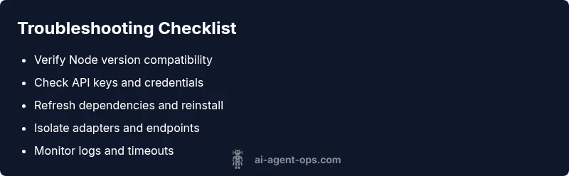 Most often, a problem in node ai agent stems from misconfiguration or missing dependencies. Start with the basics: confirm Node version compatibility, verify API keys or credentials, and re-install core packages. If the issue persists, follow the diagnostic flow to test the agent, its adapters, and the orchestration layer one by one to isolate the root cause.