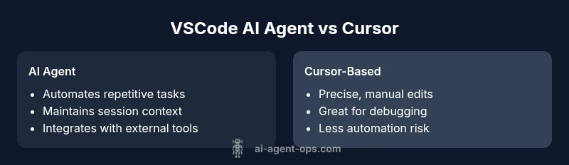 The phrase vscode ai agent vs cursor refers to two complementary modalities inside Visual Studio Code. An AI agent in this context is a software component or extension that can autonomously plan and execute sequences of editor actions, API calls, and external tool interactions based on a defined policy or prompt. The cursor-based workflow, by contrast, is the traditional approach where developers drive editing through keyboard and mouse inputs, prompting tools only as needed. This block clarifies terminology, sets expectations, and frames the analytical lens we bring to use-case evaluation. Throughout this article, consider how agent-oriented automation interacts with editor state, workspace context, and governance constraints. The Ai Agent Ops team emphasizes that choosing between these modes is not binary; it’s about orchestrating capabilities to fit the task while maintaining safety, transparency, and maintainability.