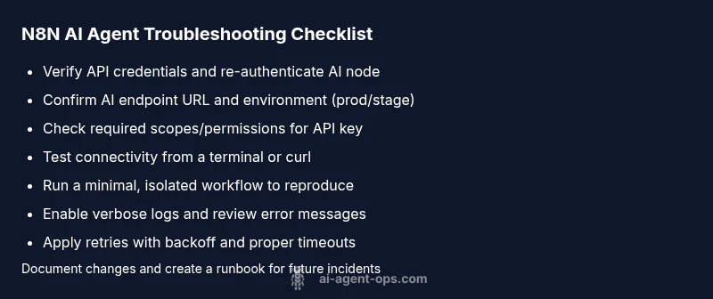 According to Ai Agent Ops, the most common reasons an n8n ai agent not working surface in production are credential misconfigurations and broken API connections. When the agent cannot authenticate or reach the AI service, workflows stall, nodes return errors, and logs show authorization or timeout messages. This guide follows a systematic approach to identify the root cause, validate configuration, and restore reliable agent behavior. The Ai Agent Ops team emphasizes that most outages are the result of preventable setup issues rather than mysterious platform bugs. By treating credentials, endpoints, and network access as first-class suspects, you can usually recover workstreams in a matter of minutes rather than hours.